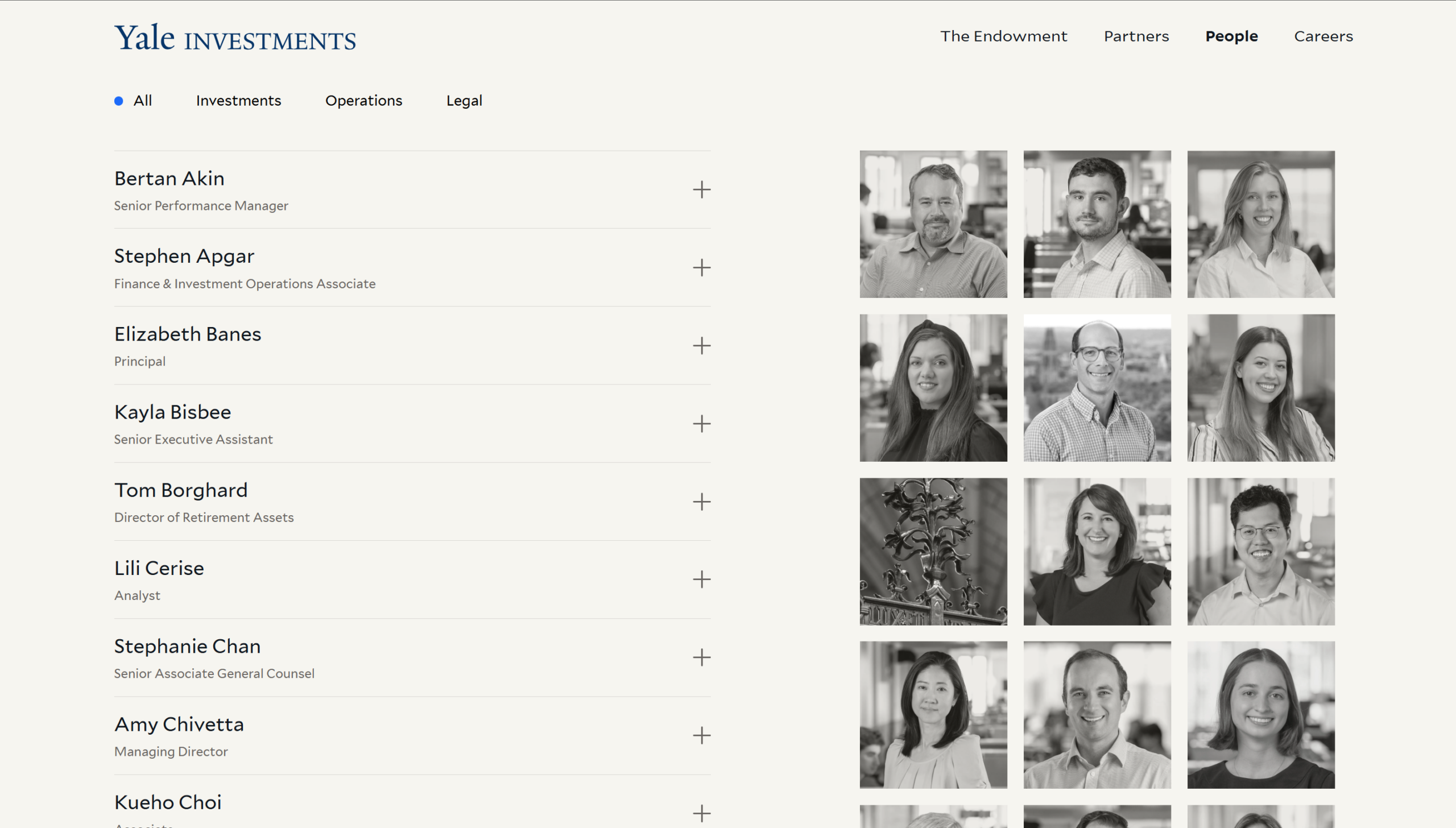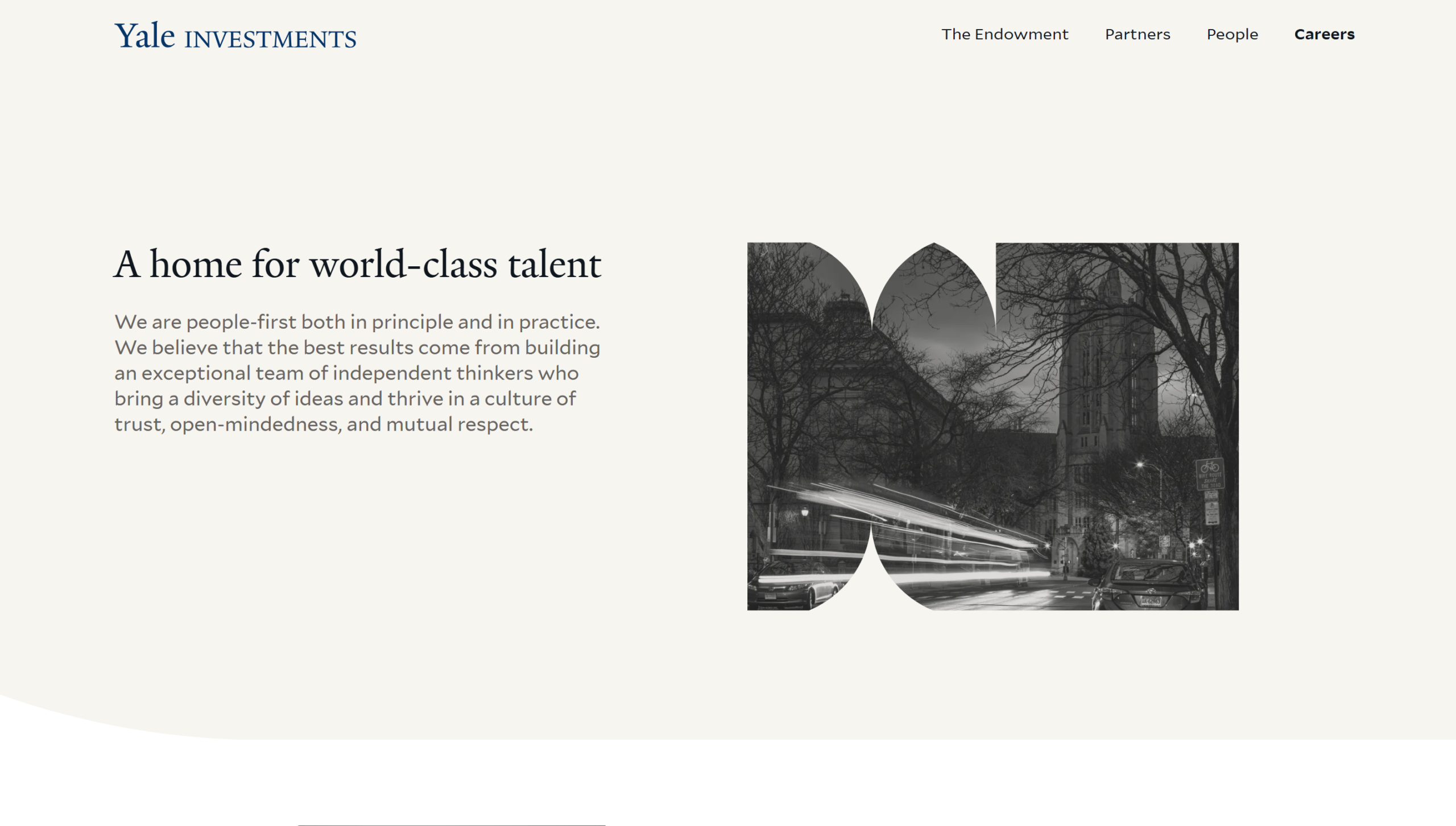 The result is a professional, content-driven website that effectively communicates the scale, transparency, and long-term vision behind Yale’s investment program while supporting their mission of advancing education, research, and innovation.